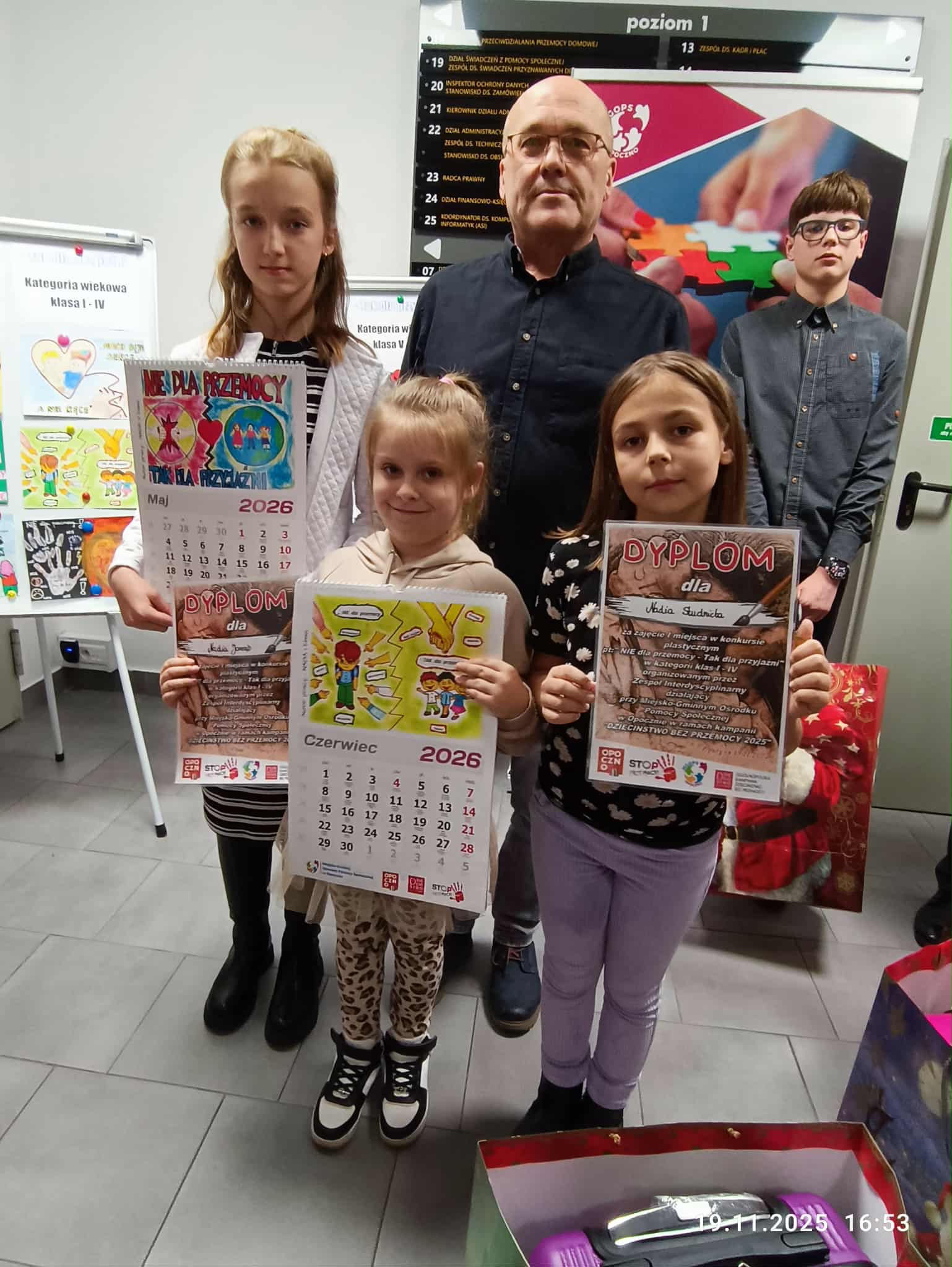 Nagrody młodym artystkom wręczyli: zastępca burmistrza Pan Jan Zięba oraz dyrektor Miejsko-Gminnego Ośrodka Pomocy Społecznej Pani Elżbieta Matyśkiewicz. Dziewczynki otrzymały też dyplomy i pięknie wydane kalendarze z reprodukcjami ich prac plastycznych. Serdecznie gratulujemy i życzymy dalszych sukcesów artystycznych. Szkolnymi koordynatorami konkursu byli pedagodzy i psycholog szkolny tj. Pani Marta Duch, Pani Kinga Wijata i Pan Andrzej Wijata.