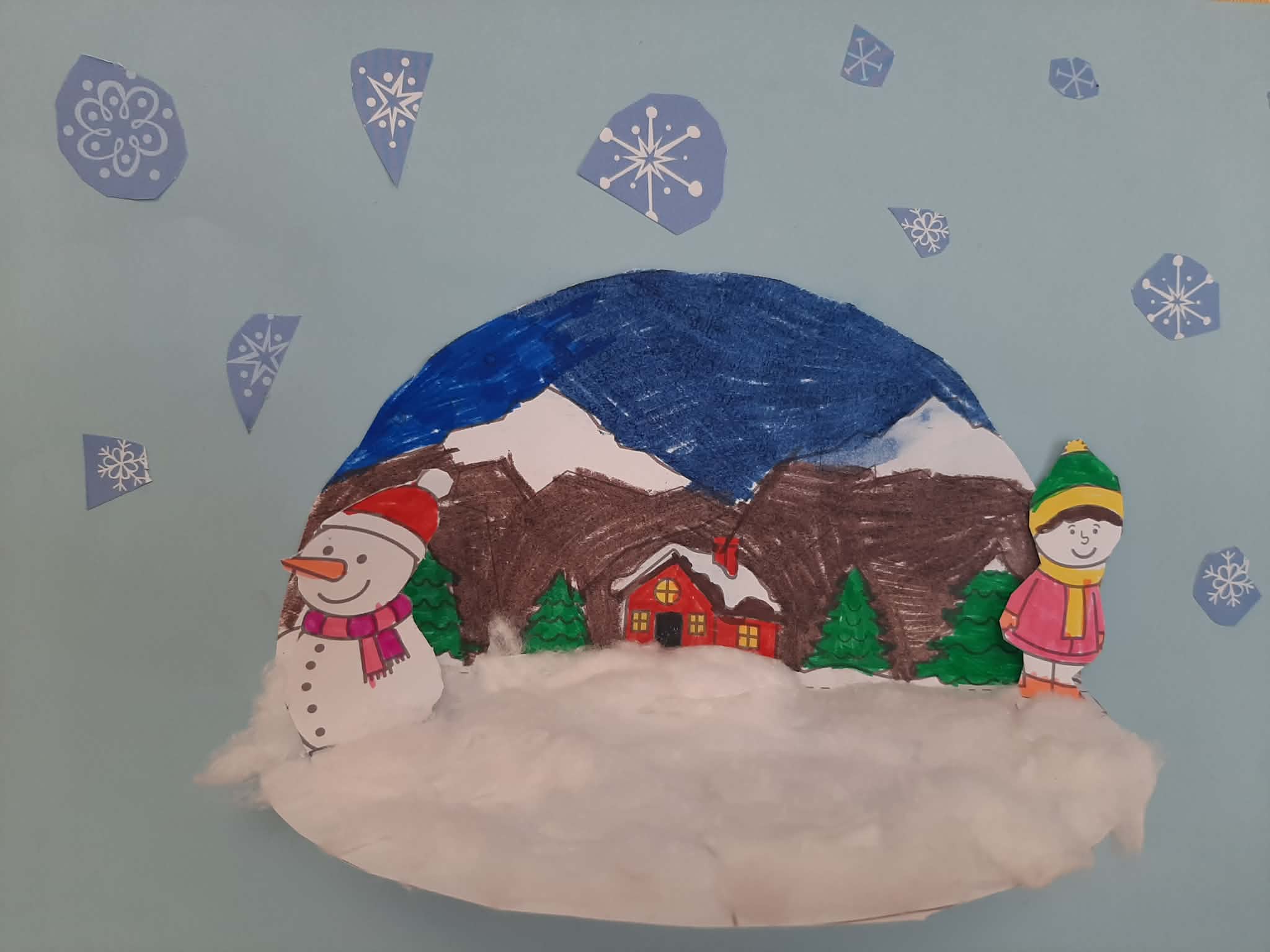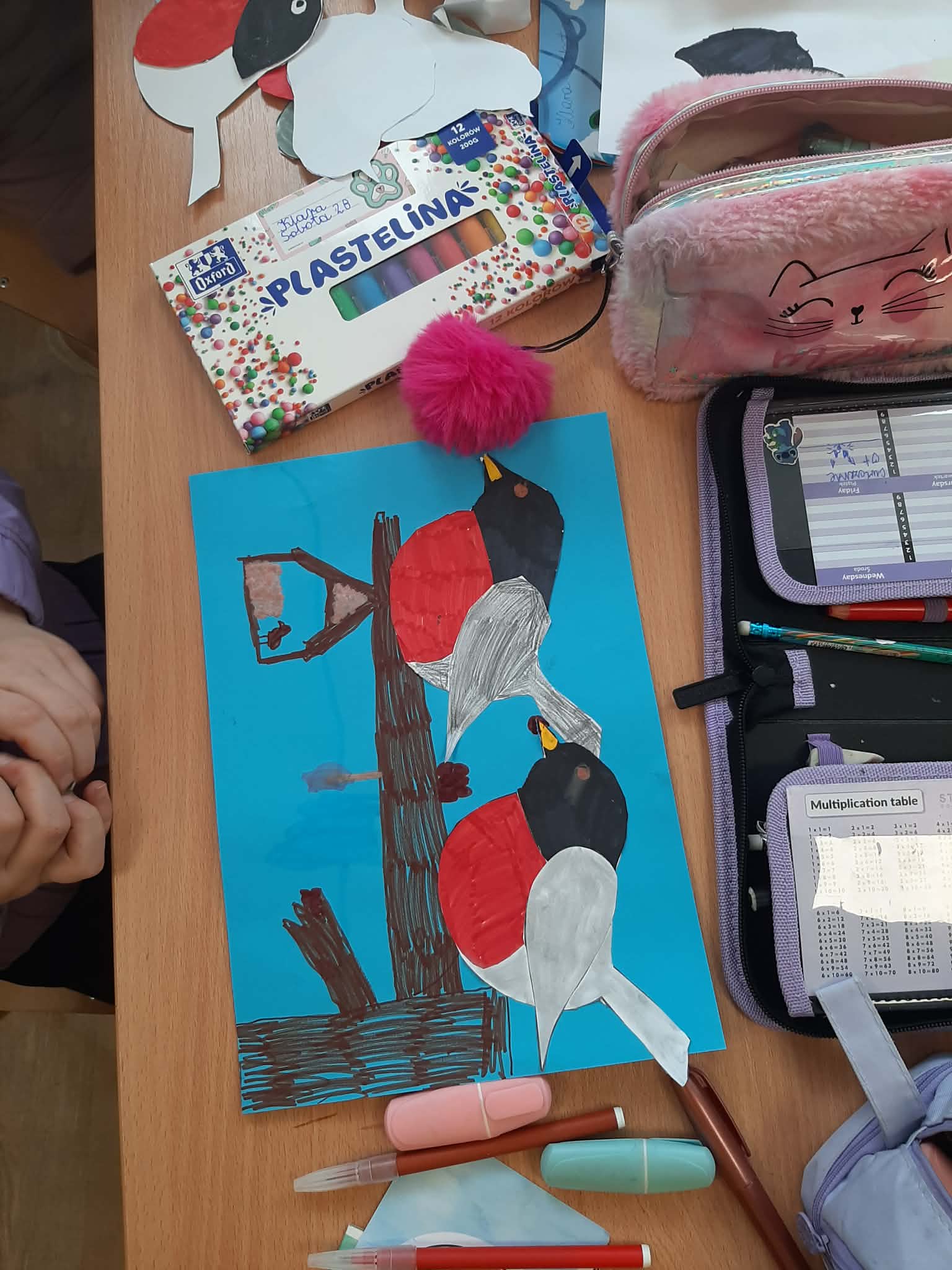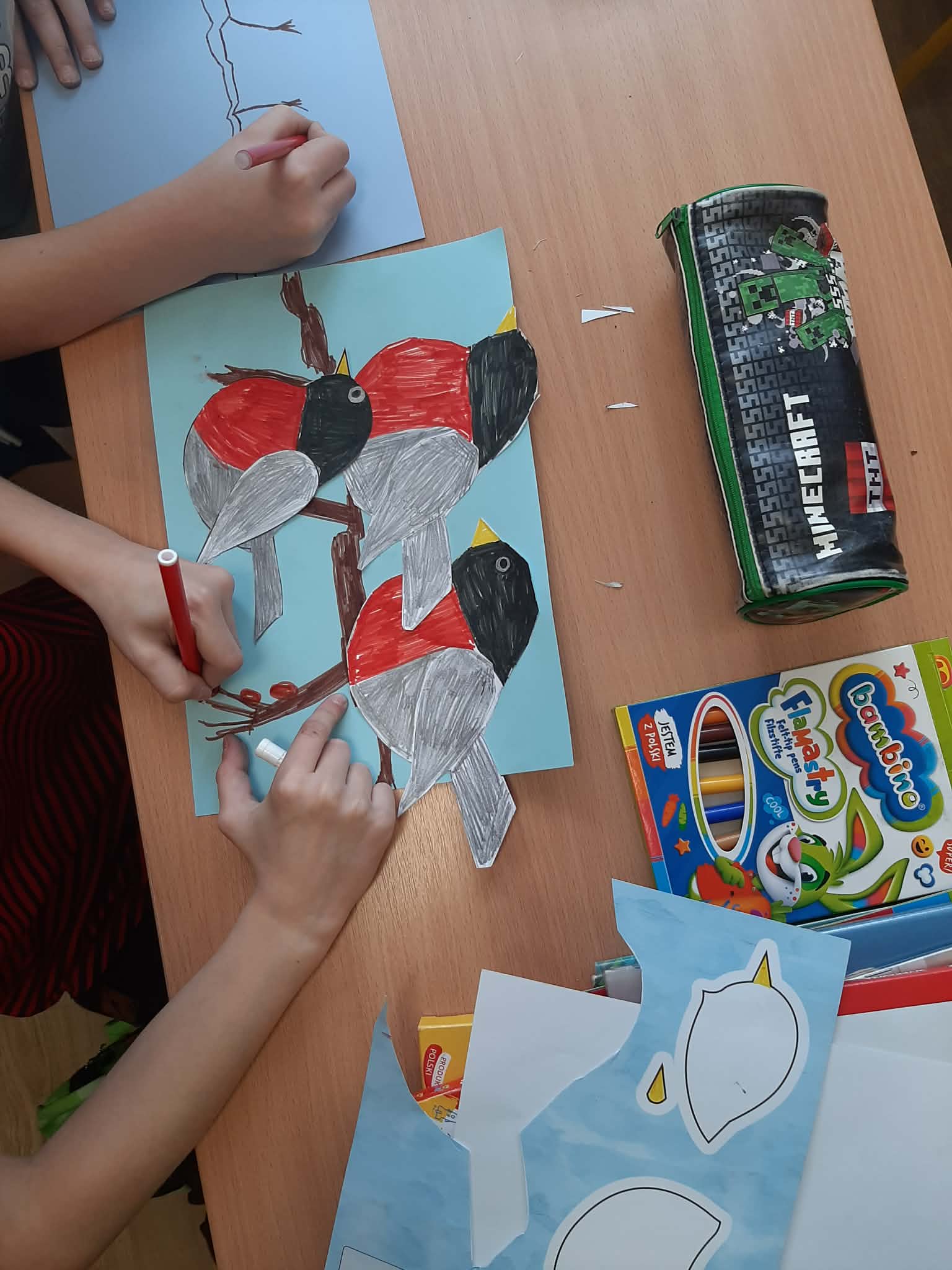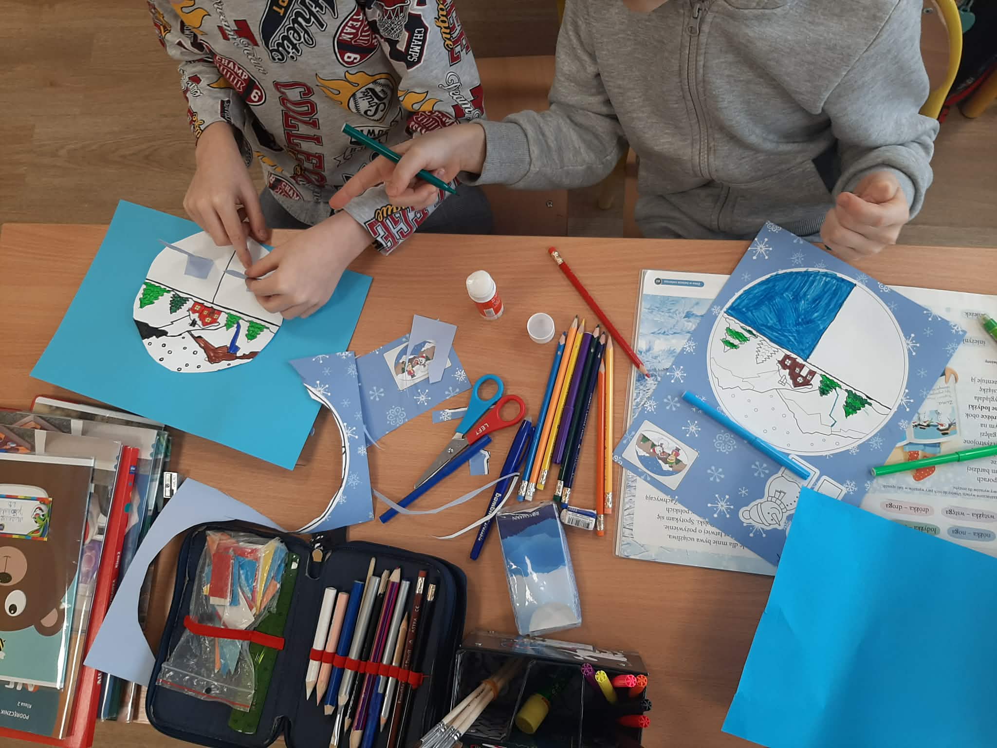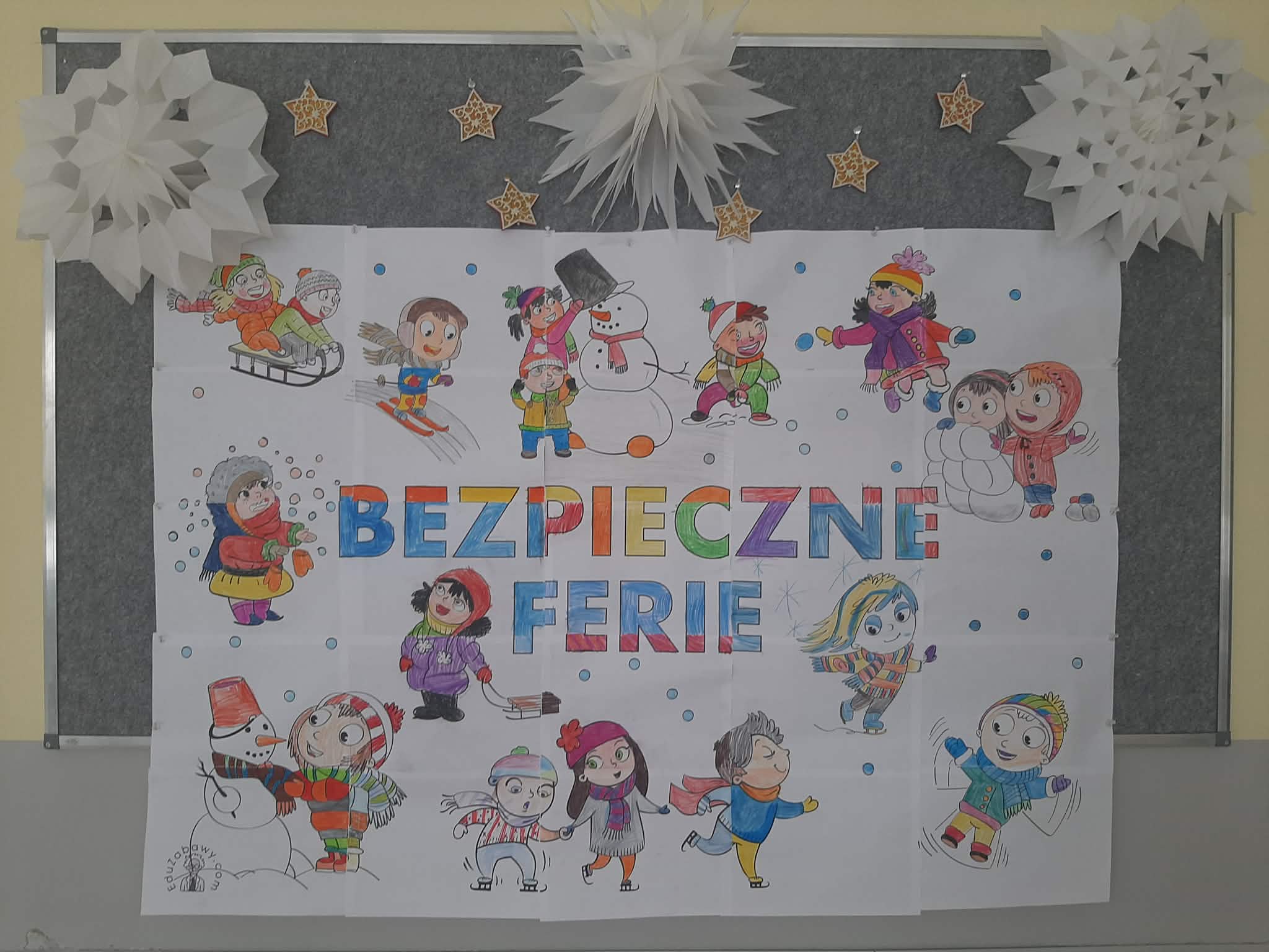 Zimowa aura dopisuje jak i inspiruje uczniów do wykonywania ciekawych prac plastycznych. Po omówieniu bloku tematycznego związanego z BEZPIECZNYMI FERIAMI dzieci wspólnie wykonały plakat.