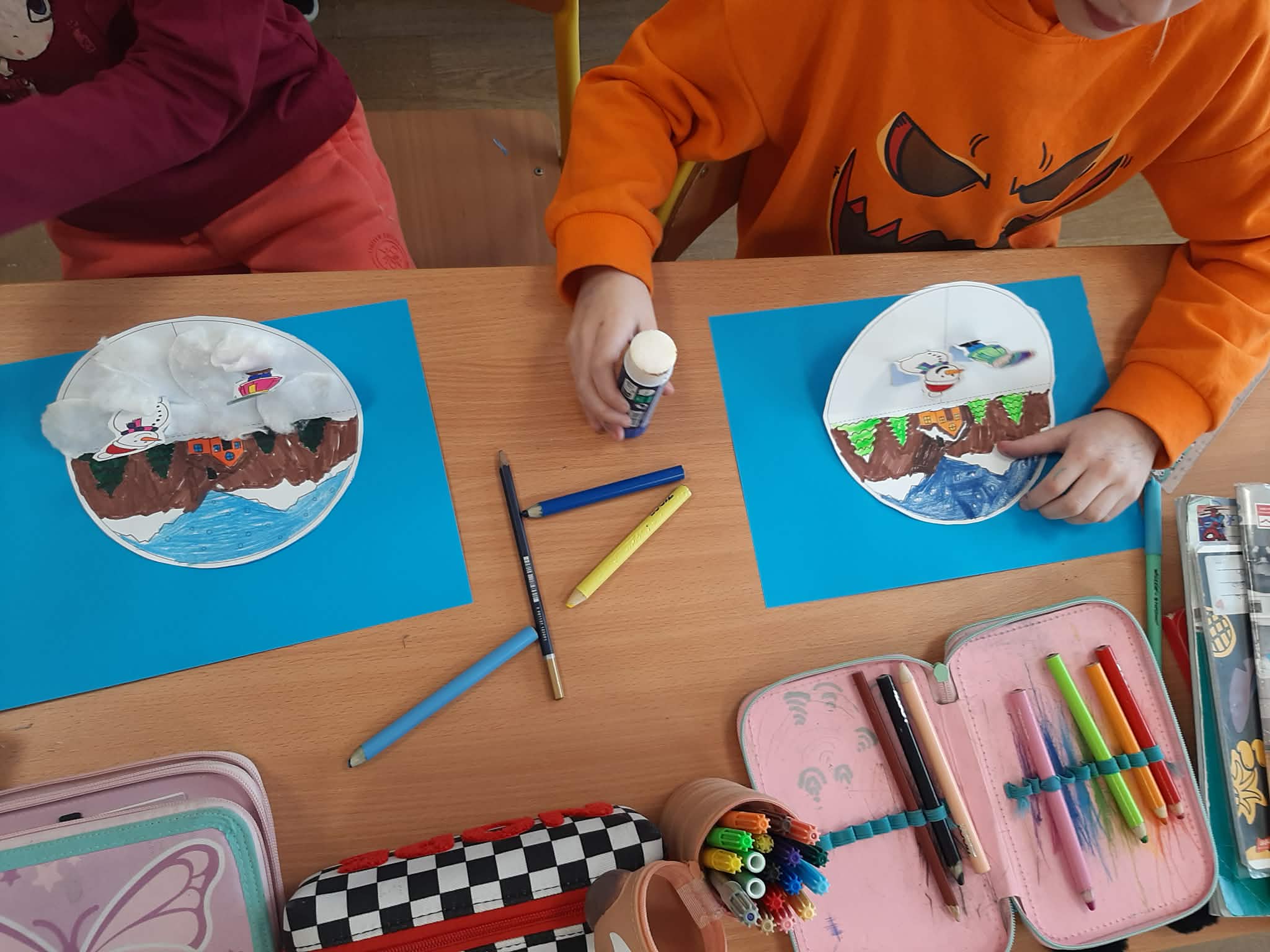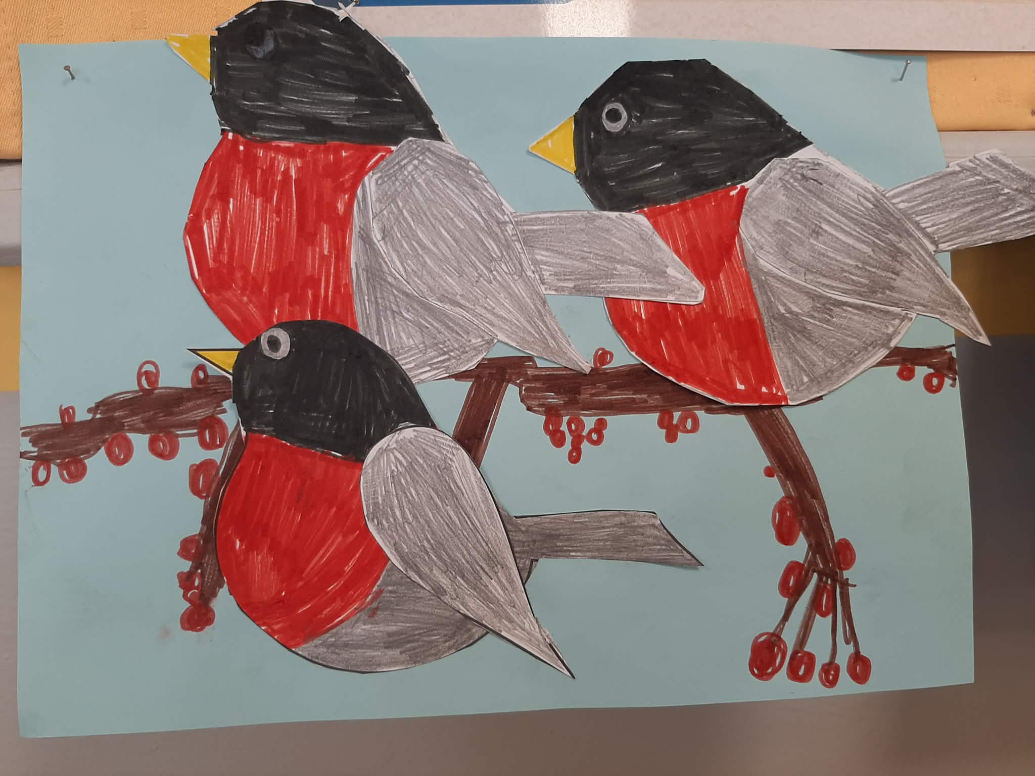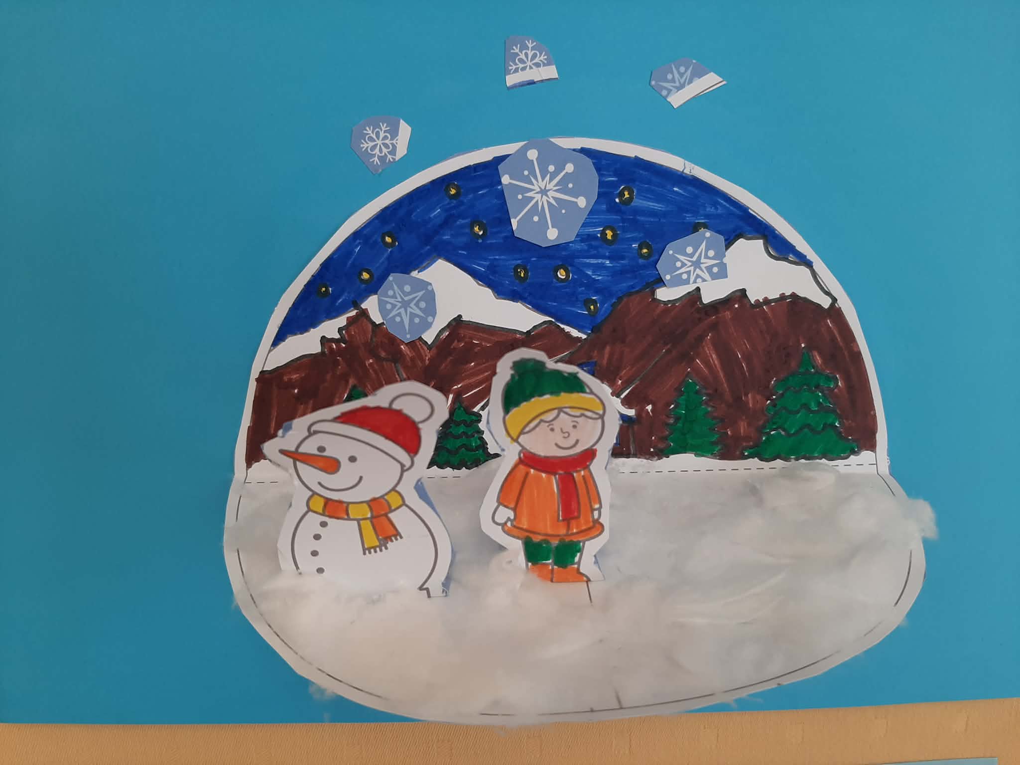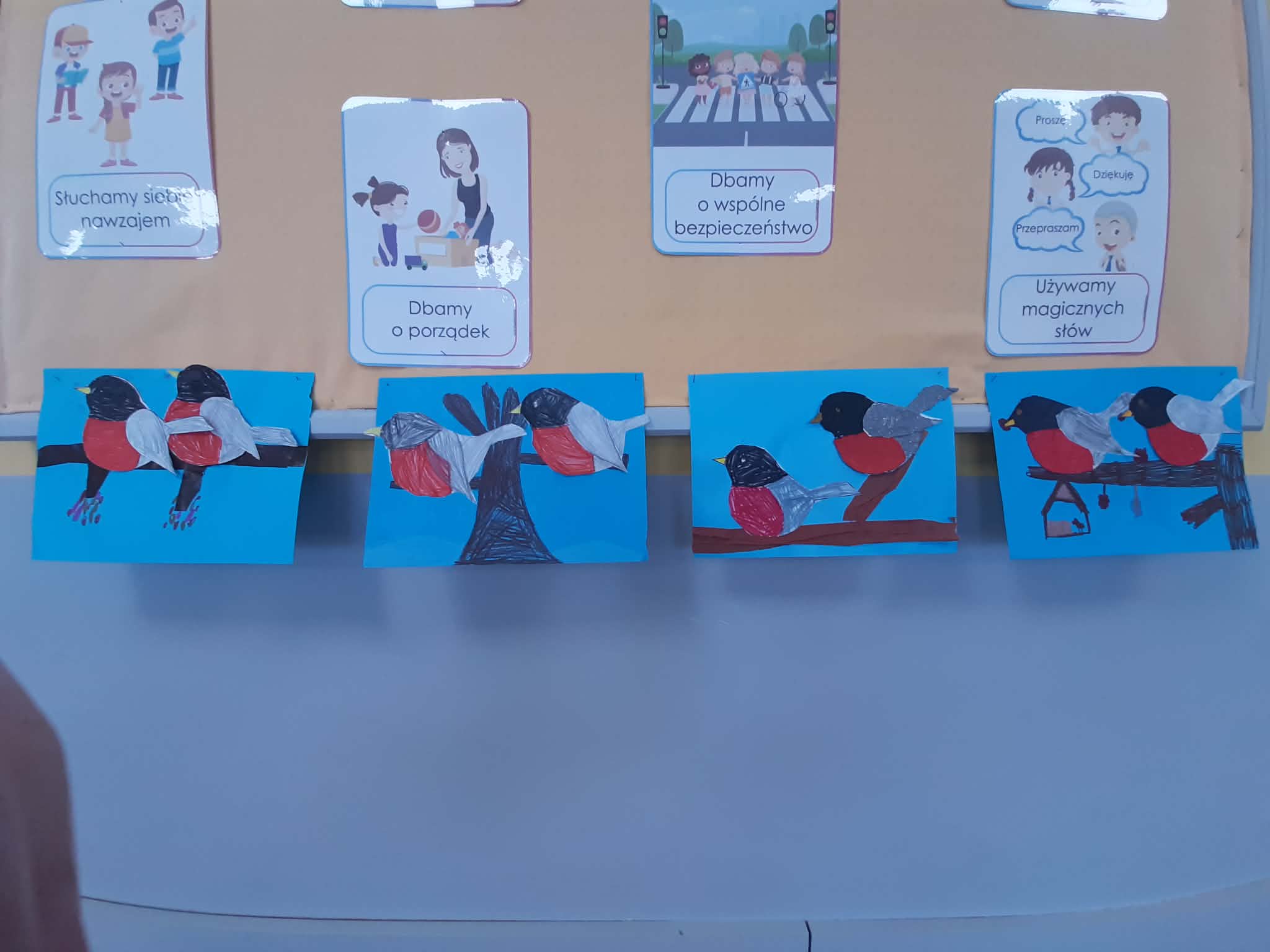 Zimowa aura dopisuje jak i inspiruje uczniów do wykonywania ciekawych prac plastycznych. Po omówieniu bloku tematycznego związanego z BEZPIECZNYMI FERIAMI dzieci wspólnie wykonały plakat.